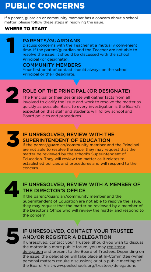 Need support but unsure who to reach out to? You can always reach out to your Trustee for help and we will always be here to support as we’re able, but please note Trustees are unable to intervene in matters of operations. The following chart is a guide for the best steps for resolving concerns. The Trustee role is defined by the Province of Ontario through the Education Act and through the Peel District School Board’s by-laws. This role is primarily a local voice in governance. Learn more about Trustee Roles and Responsibilities.