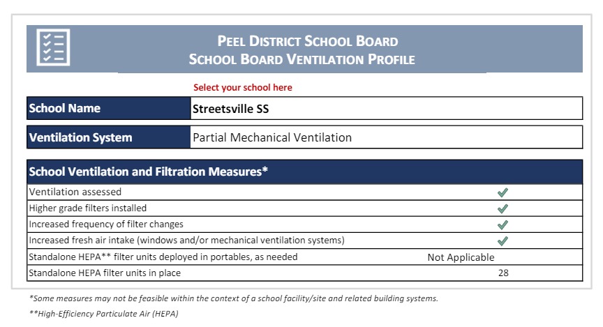 PROGRESS: A concern shared by many parents and members of staff is the air quality within our schools, and what measures are being taken to help reduce the spread of illness within our schools. On October 5th, 2023, PDSB posted the Standardized Ventilation Measures Report for every school on their individual websites. To find the status for your school, search ‘ventilation’ on your school’s website and find the report, detailing measures in place to improve air quality in your facility. Here’s an example of a report from Streetsville Secondary.